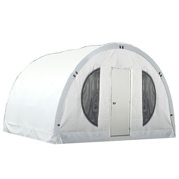 CARPA MODULAR TIPO IGLU PARA CAMPAMENTOS LARGO APROX. 6m ANCHO APROX. 6m ALTURA 3.30m. ESTRUCTURA DE ACERO, COBERTURA DE LONA PVC CAPA TERMICA DE POLIETILENO REFORZADO, VENTANAS DELANTERAS Y POSTERIOR, PUERTA DE METAL CONTRAPLACADA